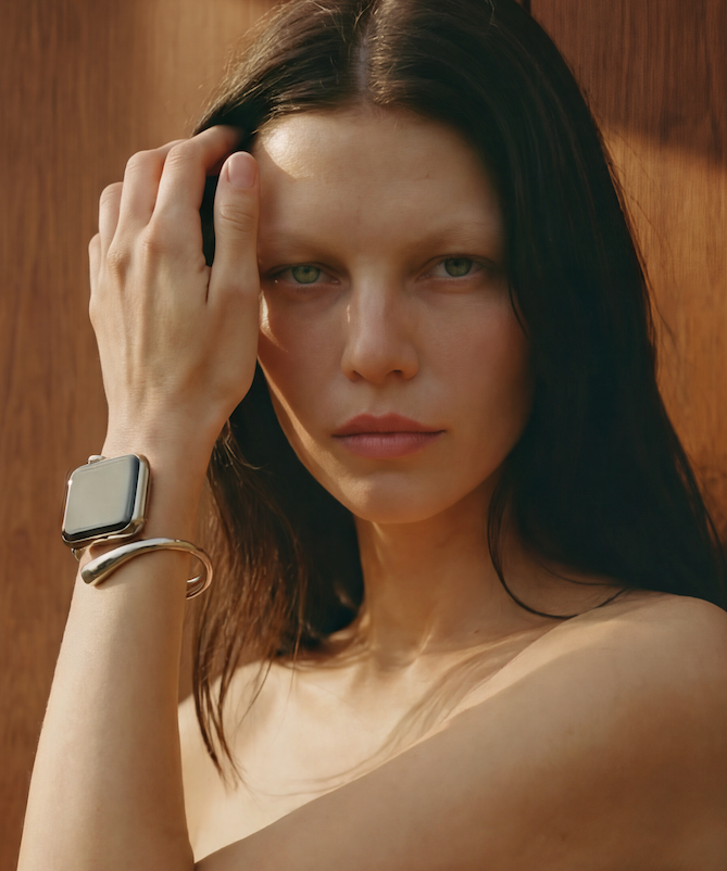 The PerDiem cuff is engineered to transform your Apple Watch to jewelry. A sculptural cuff connects to just one end of the watch body, then closes to hug the sensor to your wrist surface — no straps, no silicone, no compromise.